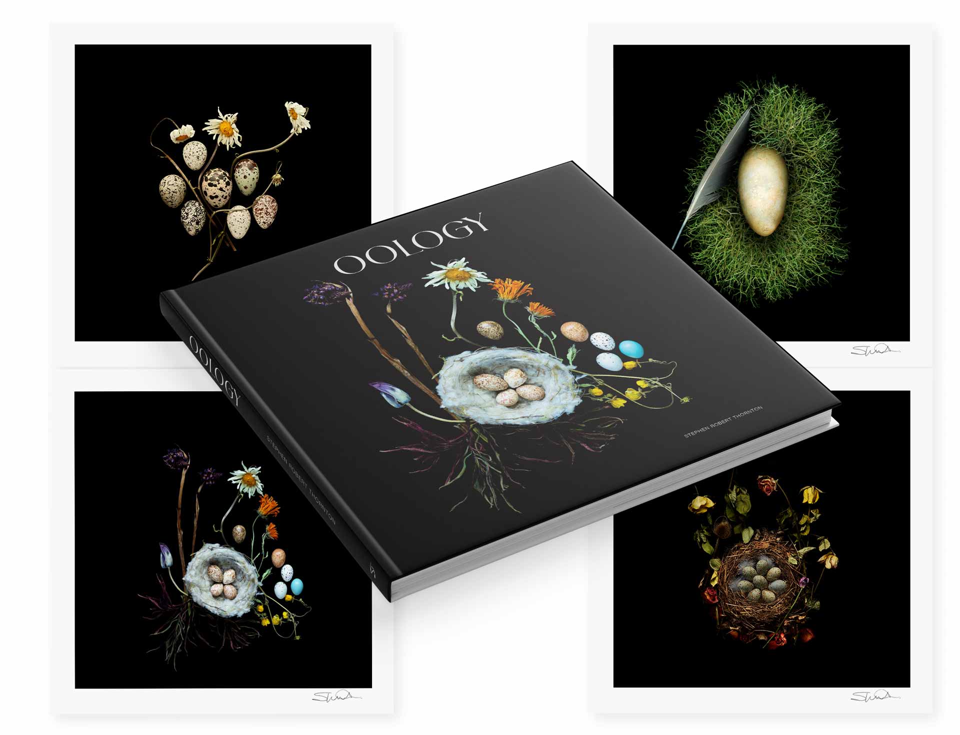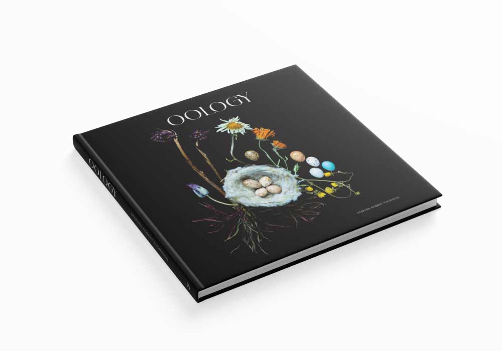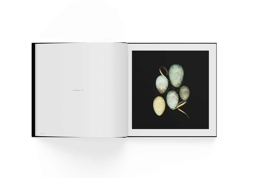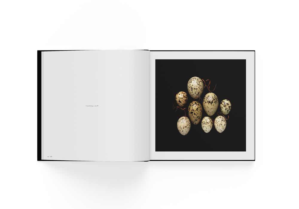 The bird’s egg photographs in this book are unique prints which pit vibrant colours against inky dark backgrounds.